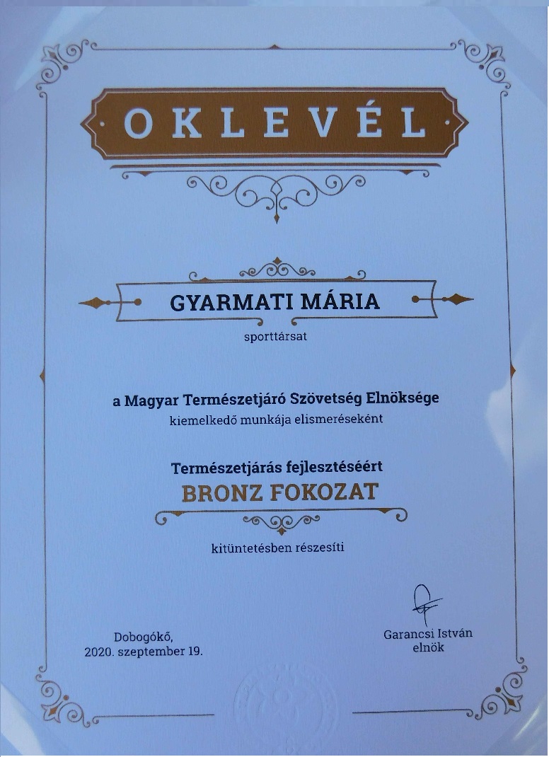 Újabb megtiszteltetés érte egyesületünket. Gyarmati Mária túratársunk a Természetjárás Fejlesztéséért Kitüntetést kapott. A kitüntetést Dobogókőn, a Természetjárók Napján vehette át.